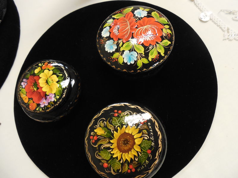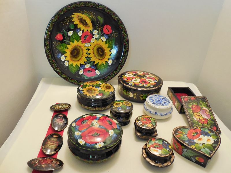 These intricately detailed lacquer-painted decorative boxes, plates, bowls, etc., are done in the classic Ukrainian Petrykivka art style.